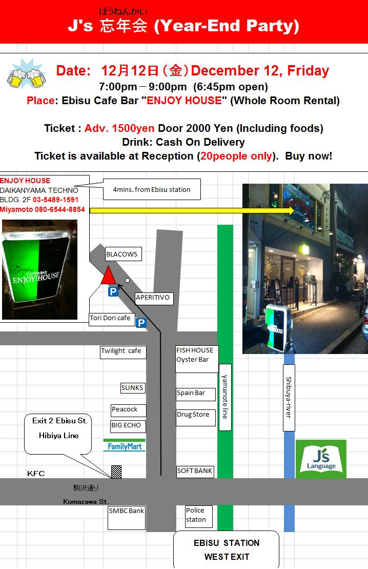 2014年12月1日 / Last updated : 2016年10月19日 master others J’s Nihongo party 2014 Dec.12 Friday 19:00 We will have a J’s Bounen-kai (year-end party) on 12th December on Friday from 7pm in Ebisu. Please feel free to visit our party. 19:00 Open 1. 19:30 Japanese game time にほんごの ことばゲーム 2. 20:30 Japanese song time: にほんごの うたゲーム Follow me! Tweet Share this:Click to share on Twitter (Opens in new window)Click to share on Facebook (Opens in new window)